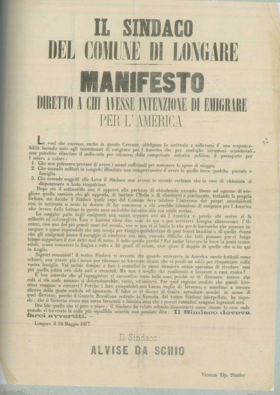 On May 24th 1877, Count Alvise Da Schio, mayor of the municipality of Longare, had a poster printed: “Addressed to those intending to emigrate to America”.