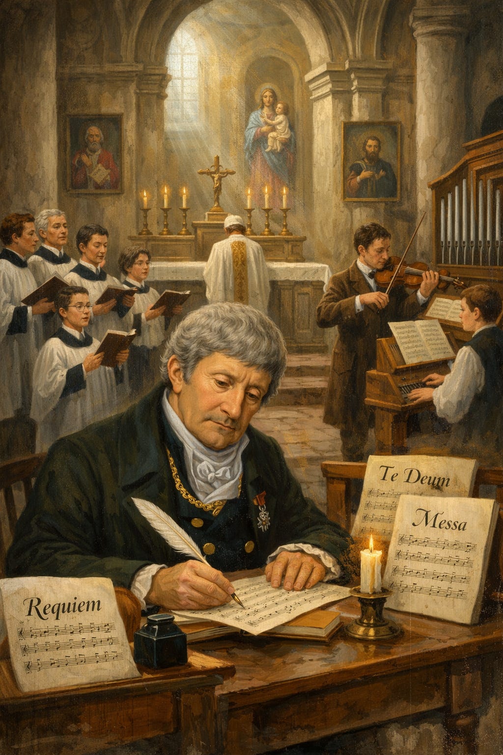 Alongside opera, Sałieri wrote a great deal of vocal and sacred music. His liturgical corpus is not as extensive as his operatic output, but it includes masses, a Requiem, Te Deum, and other compositions, often described as sober and attentive to the comprehensibility of the text, less inclined toward “theatrical” effects in church than other contemporaries.