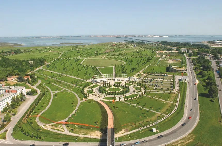 San Giuliano Park is one of Mestre’s great contemporary urban landmarks. It began life as a reclamation and conversion project for an area on the edge of the lagoon that had long been associated with degradation and misuse. The concept emerged in the early 1990s through an international design competition and was incorporated into the Master Plan, which was approved in 1996.