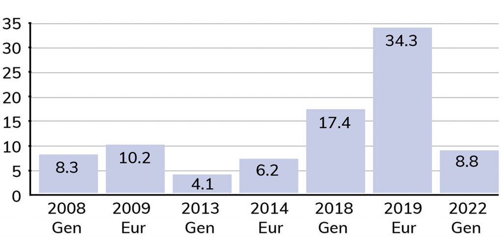 This was a remarkable U-turn: Salvini, who had once barnstormed Italy on a “No Euro” tour in 2014 to denounce the single currency, ended up backing Draghi - the former European Central Bank chief - as Prime Minister. Such reversal blunted Lega’s anti-establishment reputation and, by the time of the 2022 general election, support for the party had collapsed from its 2019 highs. The party managed only about 8.8% of the vote - perilously close to its 2013 result.