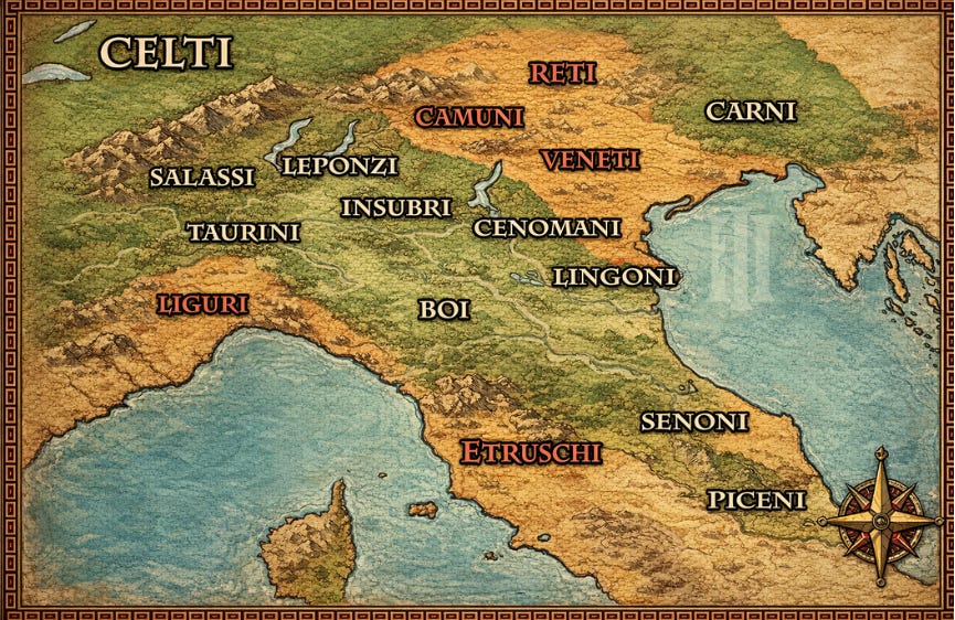 The ethnogenesis of Friul emerged from the interaction of several layers: pre-Roman populations, including Celtic-Carni and Venetic elements, followed by Romanisation and the spread of the Latin of the Aquileia area. Friulian developed out of this regional Latin base while preserving lexical and cultural traces of those earlier strata. The first of these layers dates back to the presence of Proto-Indo-European and semi-nomadic elements, which were subsequently absorbed by Palaeo-Venetian populations. The presence of these pre-Latin elements is also evidenced by the settlement of Hallstattian tribes in the region between the 5th and 4th centuries BC. The Carni people formed the first linguistic substrate of modern Friulian, a language with an extensive vocabulary of Celtic origin compared to Gallo-Italic languages.